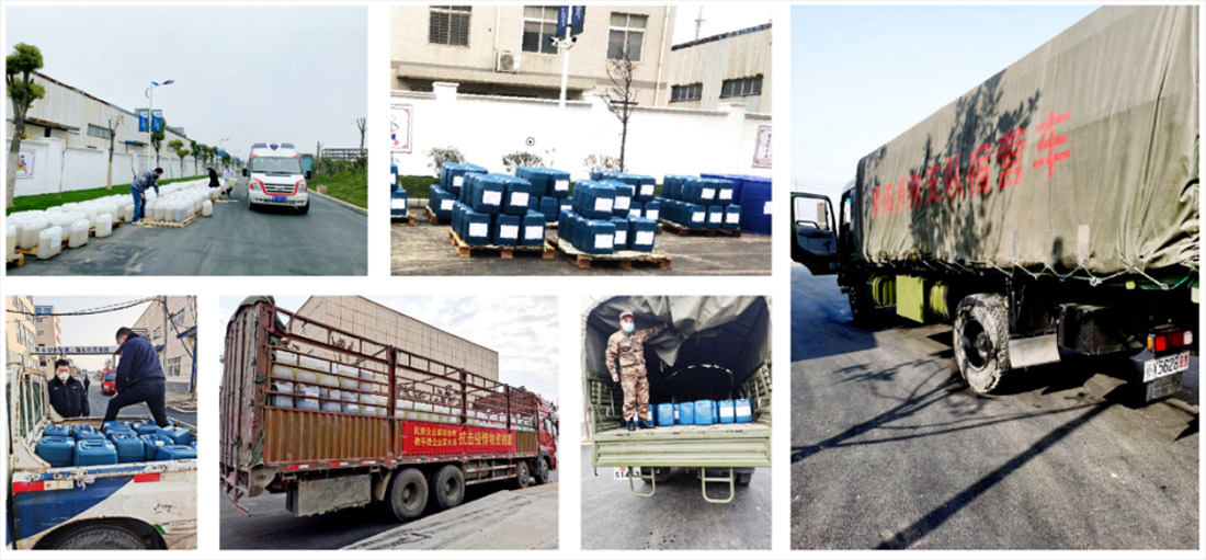 2020年年初新冠疫情全面爆發(fā),湖北又是全國的疫情中心。國難當頭,董事長(cháng)帶領(lǐng)金達成部分領(lǐng)導主動(dòng)請纓,勇?lián)厝?,面臨種種困難,發(fā)揮黨員沖鋒在前、迎難而上的作風(fēng),生產(chǎn)84消毒液原液三百余噸,市值達四百萬(wàn),全部無(wú)償捐贈給疫情最需要的地方。